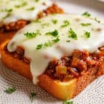 - Build the Sloppy Joe: Spoon an equal amount of the meat mixture over each slice of cheesy toast, then top each with another slice of American cheese for a double cheesy finish.