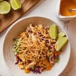 - Dress the salad: Pour the peanut dressing over the salad gradually while tossing to coat the ingredients evenly. Use as much dressing as desired for your preferred consistency. Note that any leftover salad and dressing should be stored separately from the chow mein noodles to prevent sogginess if preparing in advance.