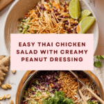 A refreshing and vibrant Thai Chicken Salad featuring shredded rotisserie chicken, crisp vegetables, and a creamy, tangy peanut dressing. This salad balances crunchy textures from cabbage, carrots, peanuts, and optional chow mein noodles with the bold flavors of lime, ginger, chili crisp, and fresh herbs like cilantro or Thai basil, making it a perfect light meal or snack with a delightful Asian-inspired twist.