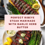 Keywords: steak marinade, ribeye steak, roasted garlic butter, roasted asparagus, steak dinner, cast iron skillet, homemade steak sauce