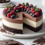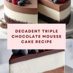This Triple Chocolate Mousse Cake is a luscious dessert featuring layers of dark, milk, and white chocolate mousse atop a crunchy cookie base. Perfect for chocolate lovers, it’s elegant yet simple to make with no baking required.