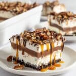 - Finish and serve: Just before serving, drizzle caramel sauce and chocolate syrup over the top of the chilled dessert. Sprinkle the remaining 1/2 cup of chopped pecans evenly across the surface. Slice into squares and serve cold for a delightful treat.